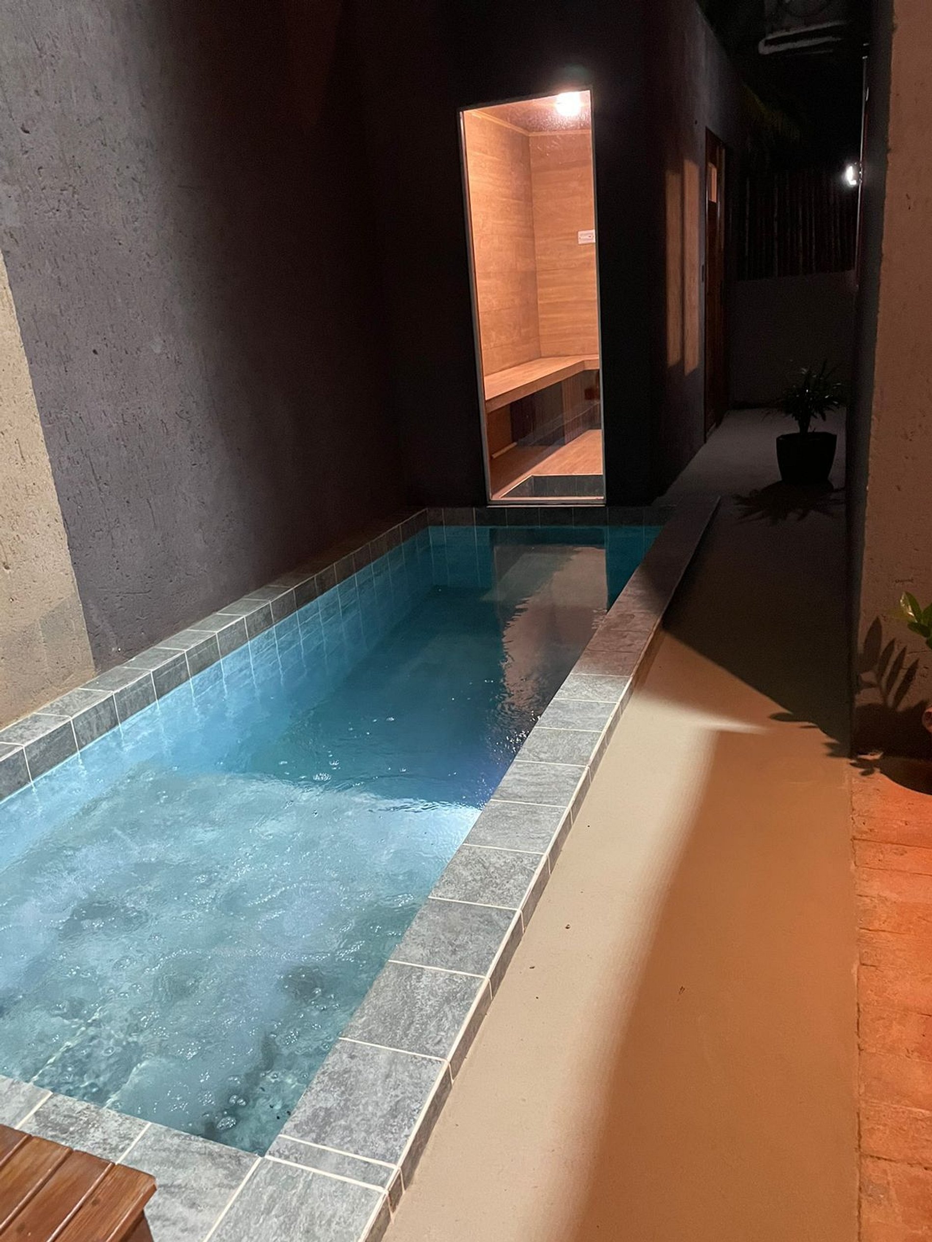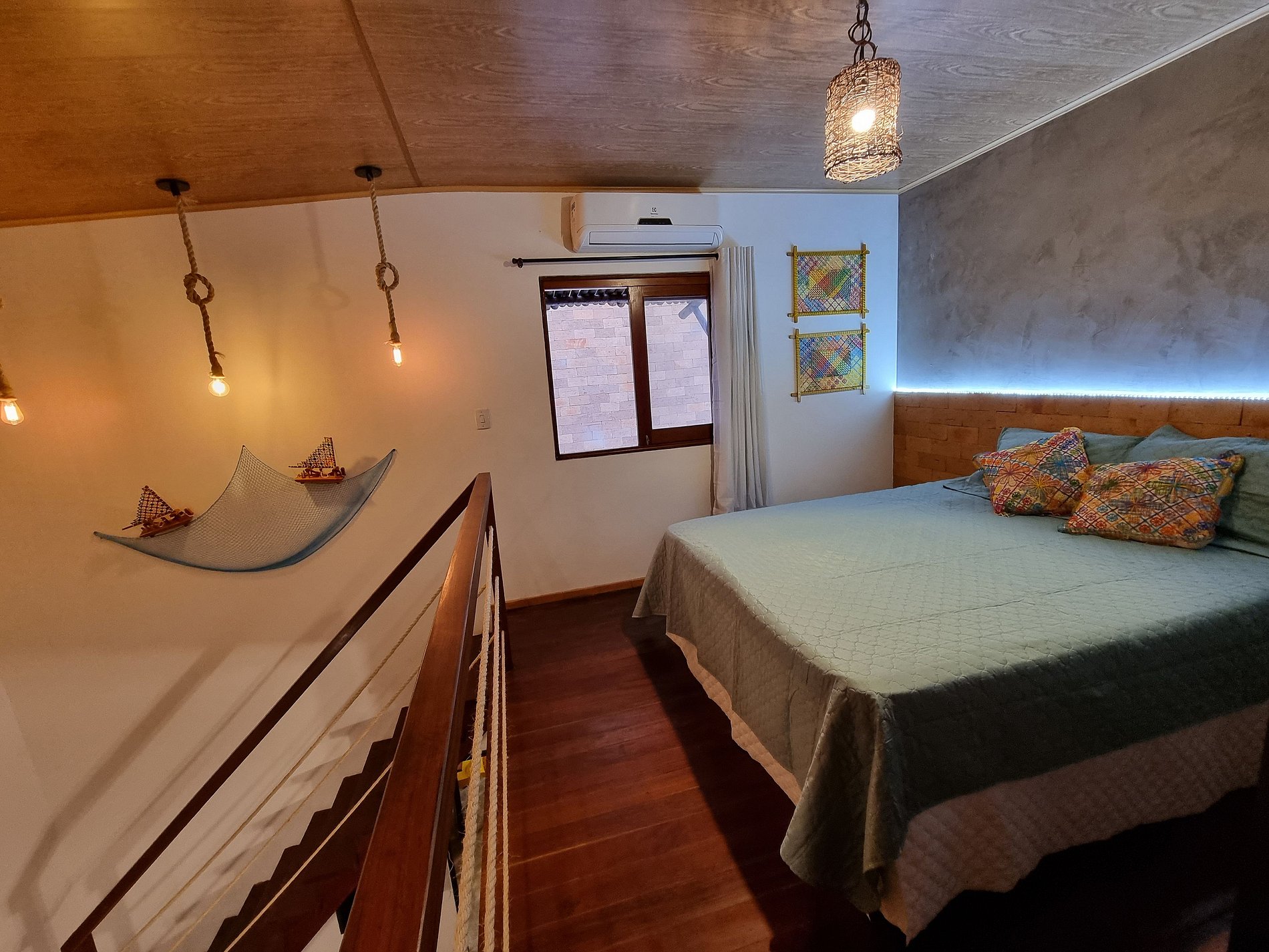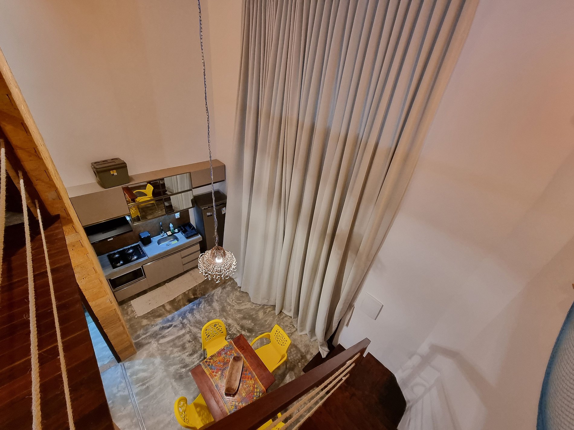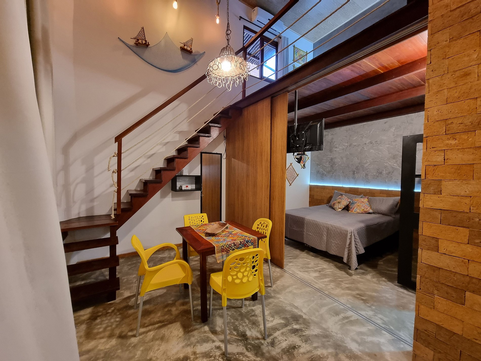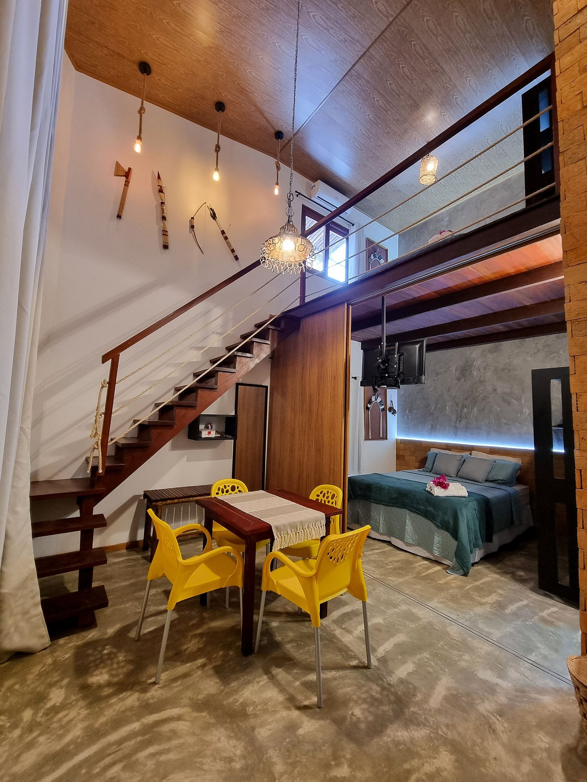 Bangalô Lage térreo: uma suite equipada cama Queen size, TV Smart, ar-condicionado split, sala, cozinha equipada com geladeira, microondas, cooktop, depurador de ar, no pavimento superior com um charmoso mezanino em madeira de lei, com acesso pela escada interna, onde estar localizada a segunda suite com cama Queen size. Externo: espaço gourmet com piscina e saúna privativa, além de churrasqueira.